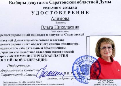 27 июля 2022 года список КПРФ был официально зарегистрирован на выборах в Саратовскую облдуму. Соответствующее решение было единогласно принято во время заседания избирательной комиссии Саратовской области.