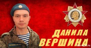 Данила Вершина родился в городе Нелидово. Вместе с родителями проживал в Западной Двине. С отличием окончил среднюю общеобразовательную школу №1 в 2016 году, после чего поступил в Великолукскую государственную академию физической культуры и спорта. Там же, в Великих Луках, в 2019 году вступил в ряды КПРФ. Служил по контракту в спецназе ВДВ и погиб 28 марта 2022 года при исполнении воинского долга на Украине. 7 июня ему исполнилось бы 24 года...