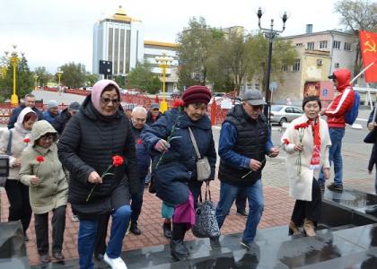 В субботу, 29 октября, церемонией возложения цветов к памятнику В.И. Ленину на центральной площади столицы Калмыкии, города Элисты, началось торжественное мероприятие Калмыцкого республиканского и Элистинского местного отделений КПРФ, республиканского и городского отделений ЛКСМ, посвященное 104-й годовщине со дня создания Ленинского Комсомола.