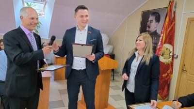 Т. М. Чершембеев – член Бюро крайкома КПРФ, депутат Думы г. Ставрополя - воспользовался временем выступления для того, чтобы поздравить всех собравшихся с днём комсомола и вручить комсомольские награды наиболее заслуженным ветеранам. В числе первых получил награду В. В. Хорунжий. Именно благодаря ему, как сказал Тамерлан, комсомол Ставрополья и состоялся в том виде, в каком он ныне существует.