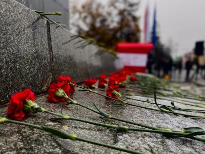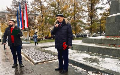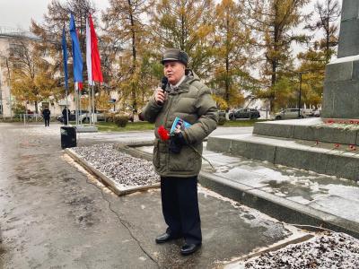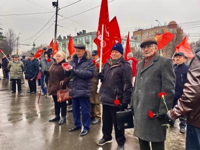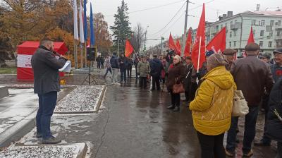 Председатель городского Совета ветеранов Василий Никитенко поздравил присутствующих на митинге со 105-й годовщиной Октябрьской социалистической революции. Он согласился с предыдущим оратором, что при нынешней политике страны утеряны те достижения, которых добился советский народ.