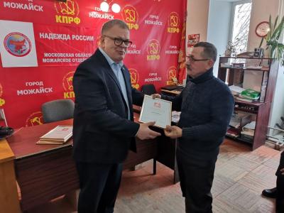 Заместитель Председателя Московской областной Думы, руководитель фракции КПРФ Александр Наумов, в помещении Можайского ГК КПРФ, вручил Благодарности Московской областной Думы за добровольческую (волонтерскую) деятельность можайским коммунистам. Он отметил большой вклад местной партийной организации в подготовку и отправку гуманитарных конвоев на Донбасс и выразил уверенность в том, что можайские коммунисты примут активное участие в организации 104-го гумконвоя на Донбасс 19 декабря.
