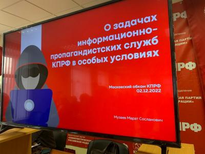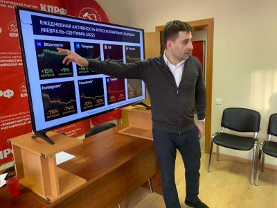 Далее слово было предоставлено Марату Музаеву - заведующему отделом интернет-коммуникаций ЦК КПРФ, заместителю заведующего отдела Центра политической учебы ЦК КПРФ. Марат Сосланович рассказал первым секретарям городских организаций МК КПРФ о ведении работы в социальных сетях, предоставив обширный доклад.