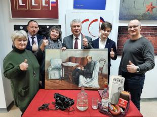 Затем лидер костромских коммунистов вручил грамоты ударникам изобразительного искусства, сделанные по образцу 30-х годов. И, между прочим, подписанные председателем ЦК КПРФ, Геннадием Андреевичем Зюгановым! Он, узнав, что в Костроме состоится такая замечательная, тематическая выставка, с удовольствием подписал эти грамоты. В свою очередь, Валерию Петровичу вручили замечательную картину, восстановленную костромскими реставраторами.