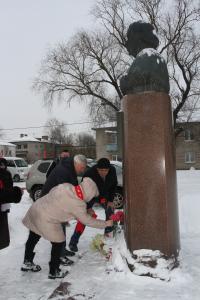 По пути следования наши товарищи делали остановки возле памятных мест. Сначала мы возложили цветы к памятнику маршалу авиации А.А. Новикову, а затем отправились в Саметь, где возложили цветы возле памятника Прасковье Малининой. Но перед возложением пришлось и потрудиться — наши товарищи расчистили снег, который засыпал всю площадку перед монументом.