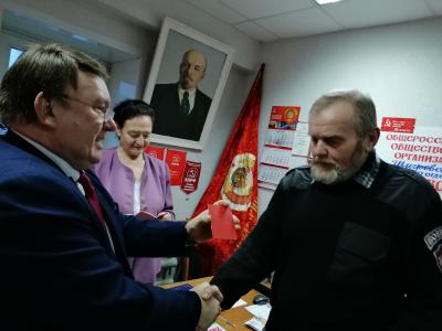 Затем Н.Н. Иванов наградил ряд товарищей юбилейной медалью ЦК КПРФ «100 лет образования СССР».