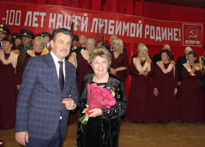 А затем на сцену вышли с поздравлениями еще три активные общественницы из регионального отделения общественного движения ВЖС «Надежда России» в лице его руководителей М.Г. Амиранашвили, В.В. Умеренкововой и одной из старейших коммунисток и активных участниц Д.М. Родиковой, прочитавшей стихотворение скоропостижно ушедшего из жизни в этом году коммуниста Александра Марочкина «Поднимаемся, старые клячи!».