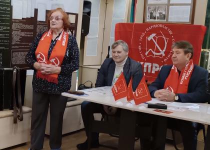 После осмотра выставки состоялись выступления членов КПРФ. С докладом выступил доктор исторических наук, профессор, заместитель секретаря регионального отделения КПРФ Р.В. Кабешев. Он охарактеризовал советскую эпоху, советскую цивилизацию с точки зрения её достижений в разных сферах жизни общества, политики руководства страны. Девизом его выступления было: не назад в СССР, а вперёд к СССР, обновлённому на базе воплощения тех идей, коими жило советское общество, на базе признания его достижений и в то же время с учётом условий, вызовов нового времени, XXI века.