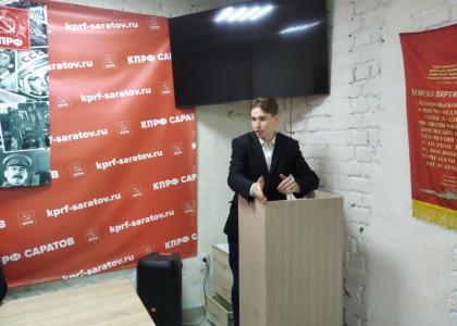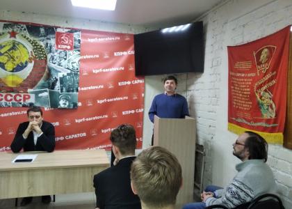 На круглом столе выступили активисты районных партийных отделений Саратова. Представитель Кировского райкома, член молодёжного парламента области Данила Жаринов рассказал о структуре и методах управления СССР, дал сравнение с современной системой государственного и муниципального управления. Первый секретарь Заводского (Сталинского) районного отделения КПРФ Виктор Черваков доложил о системе социальных гарантий, появившейся после возникновения СССР и развивавшейся вместе с Советским Союзом, о проблемах, возникших на позднем этапе существования страны. Активист Фрунзенской партийной организации, кандидат наук Михаил Поздняков раскрыл вопрос взаимоотношений республик в составе СССР, осветил в свете нынешних событий период Советско-Финской войны, показав схожесть в ходе тех событий с текущими событиями в России и вокруг неё. Представитель отделения КПРФ в Ленинском районе Саратова, кандидат наук Леонид Швейцаров выступил с обстоятельным докладом о становлении и развитии сельского хозяйства в СССР.