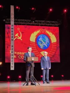 Торжественное собрание началось с видео выступления Председателя ЦК КПРФ Г.А. Зюганова о роли и значении СССР в истории российского государства. Его смотрели и слушали с большим вниманием и поддержкой.