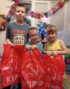 В предверии и после Нового года, Рождественских праздников и Старого Нового года, по поручению депутата Московской областной Думы, секретаря Балашихинского городского отделения КПРФ Марка Черемисова, делегация от Балашихинского отделения КПРФ: секретарь ППО "Южная", председатель ООО "Дети войны" - Ирина Косова, секретарь ППО "Заря-1" - Никита Востриков, секретарь ППО "Столичная" - Валерия Антимирова совместно с однопартийцами вручили новогодние подарки с символами года, детям мобилизованных городского округа Балашиха.