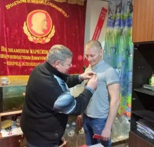 Сегодня, секретарь местного отделения партийной организации КПРФ. В.Н. Пахомов вручил Андрею партбилет, а так же копию знамени Победы, которую он собирается взять с собой, и памятную медаль к 100 образования СССР!