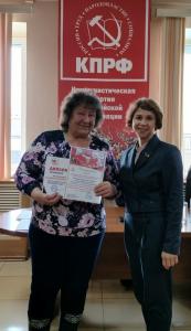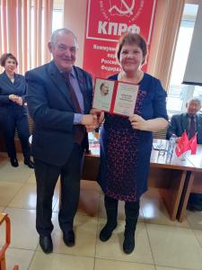 В ознаменовании 30-летия воссоздания КПРФ, первый секретарь крайкома КПРФ вручил Наталье Горюновой, первому секретарю Комитета Нерчинского местного отделения КПРФ свидетельство о внесении в Книгу Почёта коммунистов Забайкальского края.