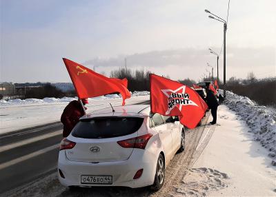 Утром наши товарищи отправились в Волгореченск, где по приглашению местных коммунистов приняли участие в автопробеге. Колонна автомобилей, украшенная красными, Советскими флагами проехала по улицам города. Прохожие приветственно махали нам руками, нам сигналили проезжающие мимо автомобили — более того, к нам добавился ещё один участник из числа местных жителей! Он проехал с нами по всему маршруту, а потом, по окончанию автопробега, познакомился с коммунистами. Будем рады видеть этого человека в наших рядах!