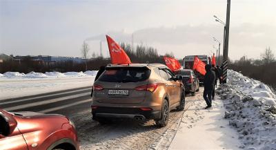 В самой Костроме провести такой автопробег оказалось невозможным — как только власть узнала о намерениях коммунистов проехать с красными флагами в честь праздника, тотчас прислала к нам в штаб полицейских, которые вынесли предостережение о недопустимости проведения таких мероприятий. Вот так, дорогие друзья! Люди не имеют права спокойно проехать по городу на машинах со знаменами, словно мы какая-то экстремистская и запрещенная организация. Поэтому мы отправились в ближайший к нам город Волгореченск, где местные коммунисты также запланировали автопробег, и где власть не стала им в этом препятствовать. И получилось, надо сказать, очень эффектно и зрелищно!