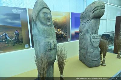Кроме постеров с изображением ключевых туристических мест Хакасии, также представлены экспозиции с национальными костюмами хакасов, копиями каменных изваяний и плит с изображением древних петроглифов.