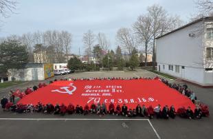 Затем все участники автомарша вместе с учениками развернули во дворе школы масштабную копию красного Знамени Победы.