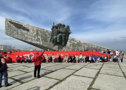На мемориале «Малая Земля» участники мобильной группы развернули масштабную копию Знамени Победы и возложили цветы.