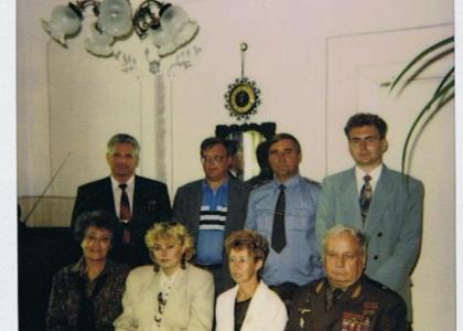 Снимок из архива В.А. Армеева. 1-й ряд, слева направо: Т.Ф. Волынова, племянница П.И. Беляева, сотрудница районного музея, летчик-космонавт В.В. Горбатко. 2-й ряд, слева направо: летчик-космонавт Б.В. Волынов, глава района А.И. Пятовский, начальник РОВД В.А. Армеев.