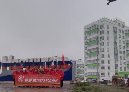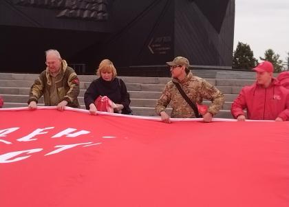 На этом священном месте, у подножия памятника мы растянули гигантскую копию Знамени Победы – символ неразрывной связи, духовного единства поколений нашей Великой страны.
