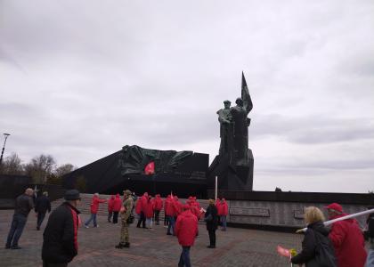 Вместе с донецкими коммунистами мы развернули копию Знамени Победы у подножия монумента и возложили цветы к Вечному огню.