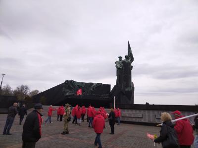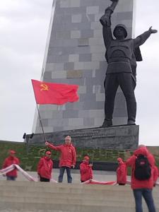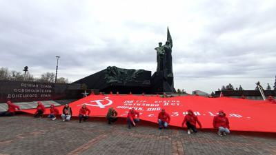 Вместе с донецкими коммунистами мы развернули копию Знамени Победы у подножия монумента и возложили цветы к Вечному огню.