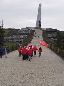 На этом священном месте, у подножия памятника мы растянули гигантскую копию Знамени Победы – символ неразрывной связи, духовного единства поколений нашей Великой страны.