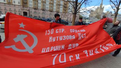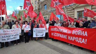 На встрече было много красных знамен, особенно копии "Знамени Победы", водруженного над поверженным фашистским рейхстагом в мае 1945 года советскими воинами-победителями. Участники встречи с депутатами держали в руках транспарант «Капитализм = война и бесправие народа!», плакаты «Разобьём цепи мирового фашизма», «Победа социализма — залог мира на земле!».