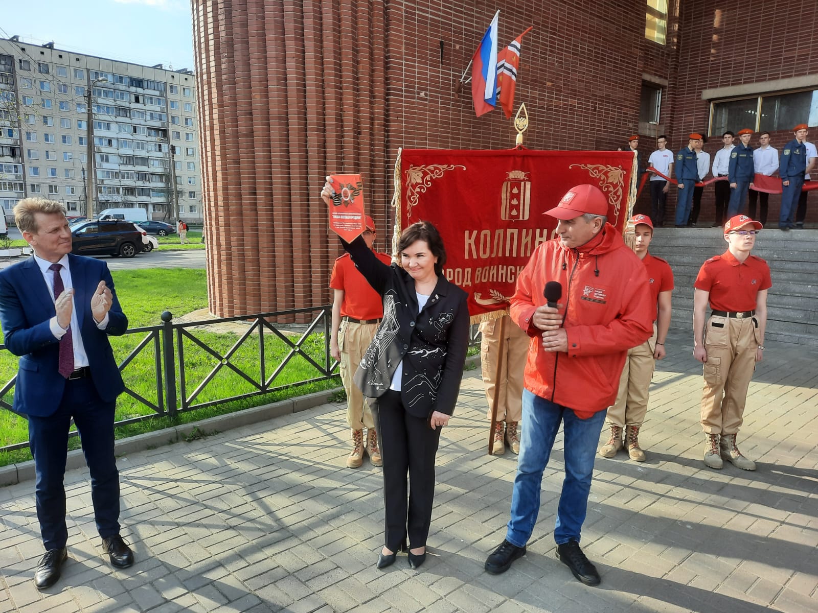 В центре города, рядом с культурно-досуговым центром «Подвиг» прошёл торж6ественный митинг и состоялось торжественное раскрытие копии Знамени Победы. Участие в торжественном мероприятии приняли сотни человек - представители молодёжно-патриотических объединений, жители Колпино, а также руководство города, в том числе его глава Юлия Логвиненко.