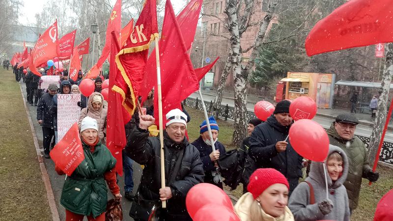 В 11-30 колонна начала движение. Впереди — руководители партийной организации: первый секретарь областного комитета КПРФ, мэр Новосибирска Анатолий Локоть, секретари областного комитета Роман Яковлев, Алексей Русаков, Глеб Черепанов и Владимир Карпов.