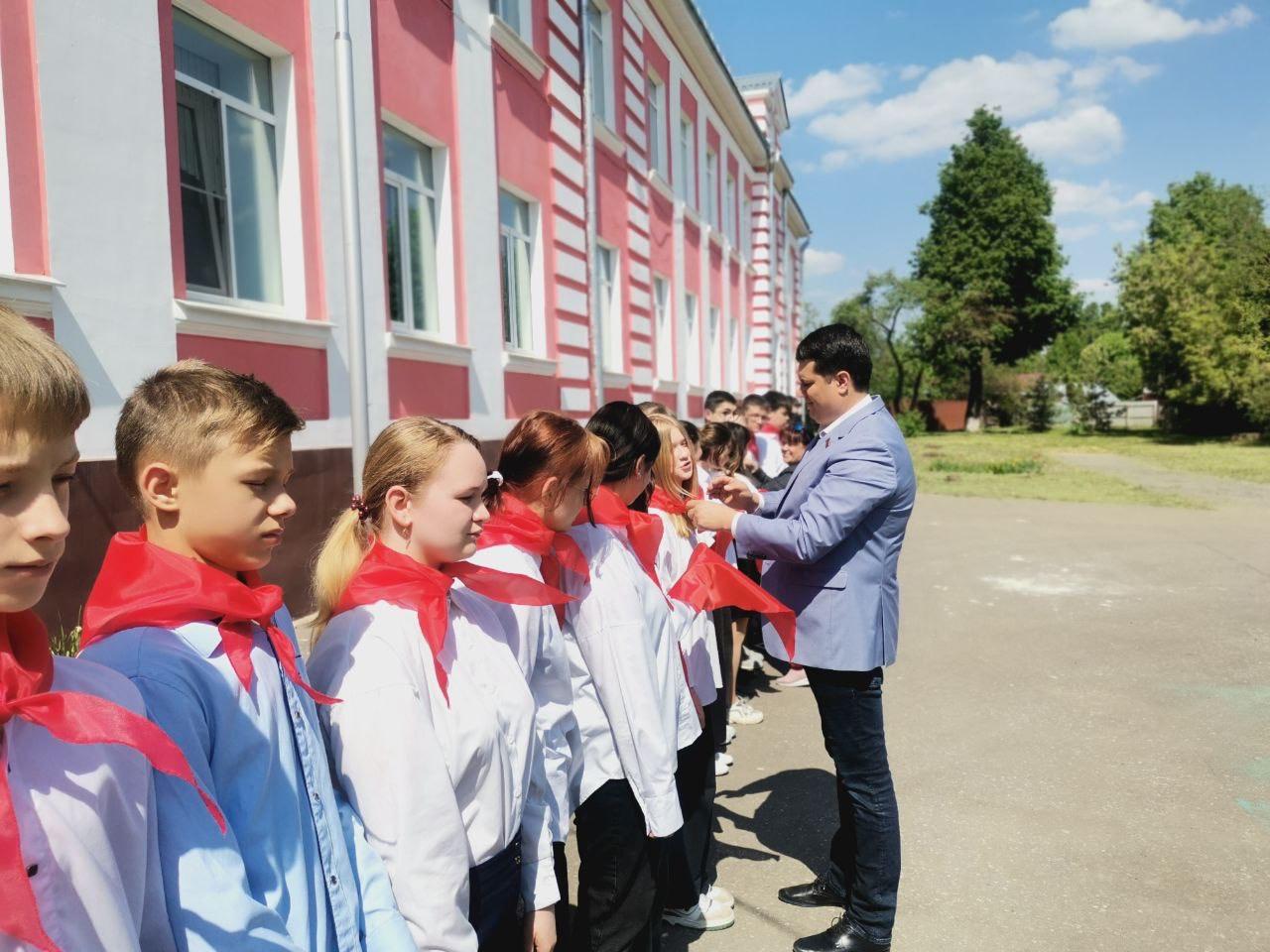 Красные галстуки семиклассникам повязали первый секретарь Тульского обкома КПРФ, руководитель фракции КПРФ в Тульской городской Думе Алексей Лебедев, заместитель председателя фракции КПРФ в Тульской областной Думе Светлана Белоус, секретарь обкома по идеологии, главный редактор газеты «Тульская правда» Михаил Фёдоров.