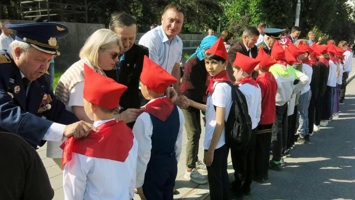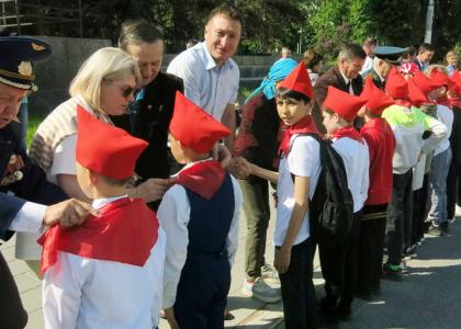 Ветераны пионерского движения повязали новоявленным пионерам галстуки и прикрепили пионерские значки, вручили цветы.