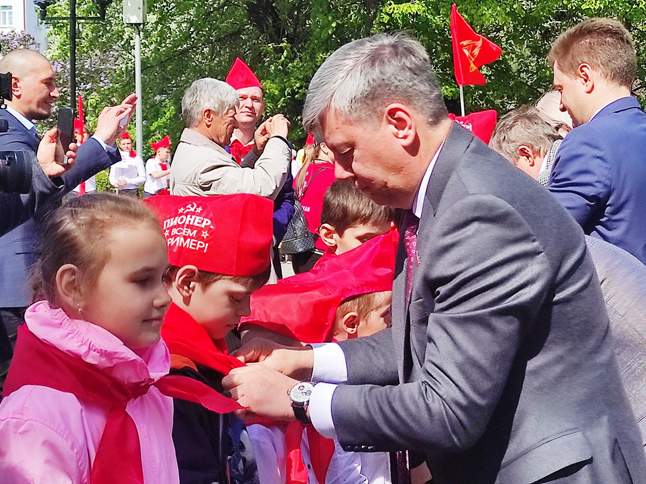 Ребят также поздравил секретарь ЦК КПРФ, первый секретарь ЦК Ленинского комсомола Владимир Исаков и отметил, что будущее за красногалстучной Ленинской пионерией.
