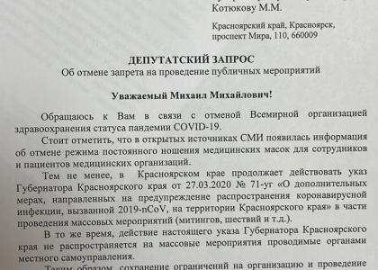 Депутату КПРФ в городском Совете Красноярска Игорю Сорокину пришел ответ от прокурора края Романа Тютюника на письмо с предложением снять COVID-ограничения на публичные и протестные мероприятия. Прокуратура рассмотрела обращение депутата и направила его в краевой Роспотребнадзор. Санитарное ведомство предложило врио губернатора края Котюкову снять ограничения в связи со снижением уровня заболеваемости COVID-19 в крае.