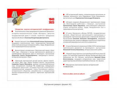 Накануне 80-летия парада партизан, который состоялся в городе первого салюта 19 сентября 1943 года, прошла посвящённая этой дате научно-историческая конференция. В Орловской областной публичной библиотеке имени И.Бунина собрались представители ветеранского сообщества региона, советского партийно-хозяйственного актива, бывшие работники различных отраслей народного хозяйства, науки, культуры, ветераны Вооружённых Сил, правоохранительных органов и госбезопасности. Приехали гости из Брянской области, которая в годы Великой Отечественной войны была одним из центров партизанского движения на территориях Советского Союза, оккупированных немецко-фашистскими захватчиками. Организаторами мероприятия выступили Орловский историко-патриотический клуб «Ветеран», областной Совет ветеранов войны и труда и коллектив библиотеки.
