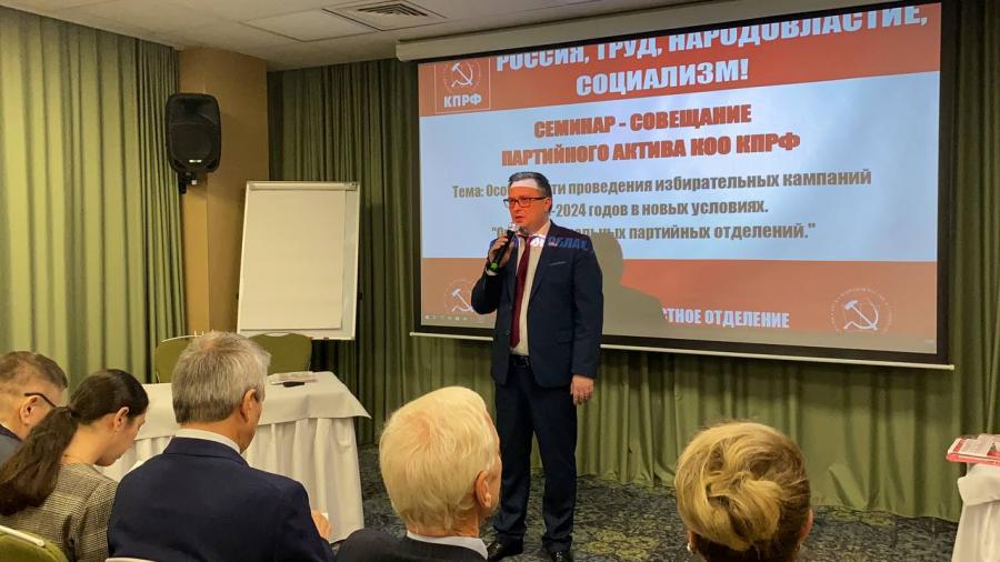Перед участниками семинара с докладом ««Уроки ЕДГ-2023 и концептуальные подходы к участию КПРФ в президентской кампании 2024 года» выступил член Президиума, секретарь ЦК КПРФ Сергей Обухов.