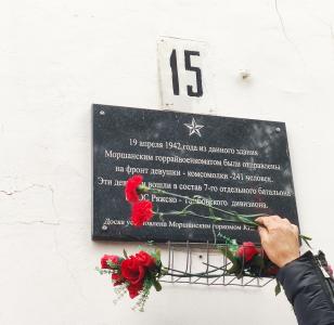 Историю жизни моршанского комсомола продолжил Ю.М. Попов, у мемориальной доски поведав о событиях 1942 года, когда более 240 девушек бесстрашно ушли сражаться за советскую Родину в составе 7-го отдельного батальона воздушного наблюдения, оповещения и связи (ВНОС) Ряжско-Тамбовского дивизиона. К сожалению, не все из них вернулись домой. Мемориальная доска была установлена на здании бывшего военкомата (ныне казначейство) горкомом КПРФ ещё четыре года назад. Инициатором выступил Валентин Павлович Лёвочкин, сын одной из участниц войны, вернувшейся с фронта, Валентины Натальиной.