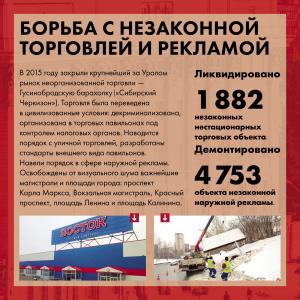 Наводится порядок с уличной торговлей, разработаны стандарты внешнего вида павильонов. Ликвидировано 1 882 незаконных нестационарных торговых объекта.