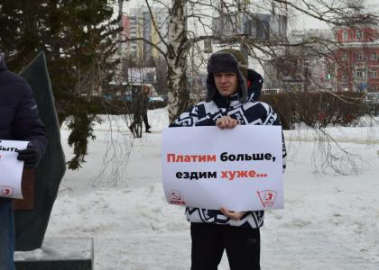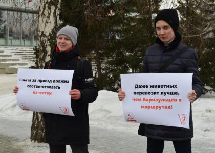 В Барнауле комсомольцы 27 января провели пикет по проблемам общественного транспорта в городе. Поводом для протестной акции стали планы предприятий-перевозчиков повысить плату за проезд с 30 до 35 рублей. Предыдущее повышение цен, отмечают участники акции, к сожалению, не отразилось на качестве услуг.