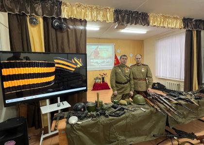 По завершении мероприятия участники военно-исторического клуба реконструкторов «Левый берег» и историко-культурного центра «СТАЛИН-ЦЕНТР» познакомили детей с макетами оружия и снаряжения солдат времен Великой Отечественной войны, что вызвало большой интерес у школьников.