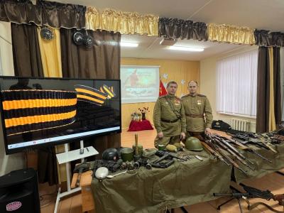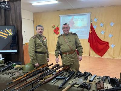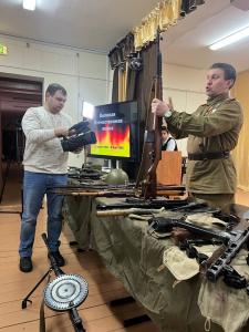 По завершении мероприятия участники военно-исторического клуба реконструкторов «Левый берег» и историко-культурного центра «СТАЛИН-ЦЕНТР» познакомили детей с макетами оружия и снаряжения солдат времен Великой Отечественной войны, что вызвало большой интерес у школьников.