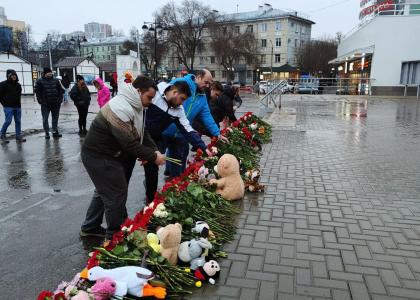 В течение всего дня рязанцы приносили живые цветы, свечи и игрушки к стихийному мемориалу у Муниципального культурного центра. Рязанские коммунисты и комсомольцы также возложили цветы и почтили память погибших.