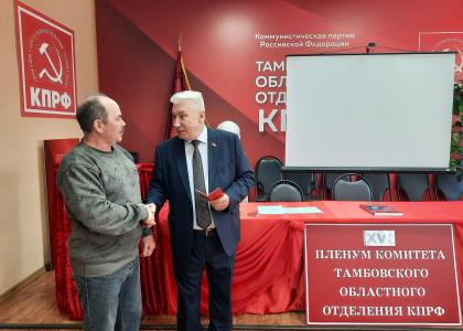 Перед началом пленума А.И. Жидков вручил партийные билеты вступившим в КПРФ в Моршанском районном отделении партии товарищам Ю.Н. Мизеву и А.В. Паршину, работающим в сельхозпредприятии Моршанского округа «Нива+». А доверенным лицам кандидата Н.М. Харитонова на выборах Президента РФ Л.Н. Конобееву и Н.И. Нечаевой второй секретарь обкома Е.В. Козодаева в память о прошедших дебатах вручила фото, сделанные в телестудии.