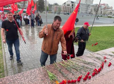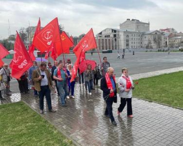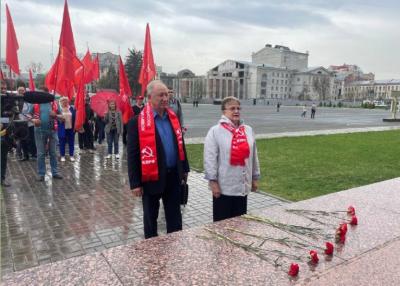 Затем праздничная колонна, украшенная множеством алых флагов КПРФ и ярким транспарантом, на котором было начертано: «Ленин жил! Ленин жив! Ленин будет жить!», двинулись к памятнику В.И. Ленину на площади Революции, где были возложены цветы.
