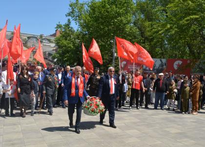 Колонна во главе с первым секретарем Дагестанского республиканского отделения КПРФ, руководителем фракции КПРФ в Народном Собрании РД Самиром Абдулхаликовым двинулась с центральной площади города им.В.И.Ленина по улице Героя Советского Союза Магомета Гаджиева в парк им.Ленинского Комсомола к Мемориалу воинам, павшим в Великой Отечественной войне.
