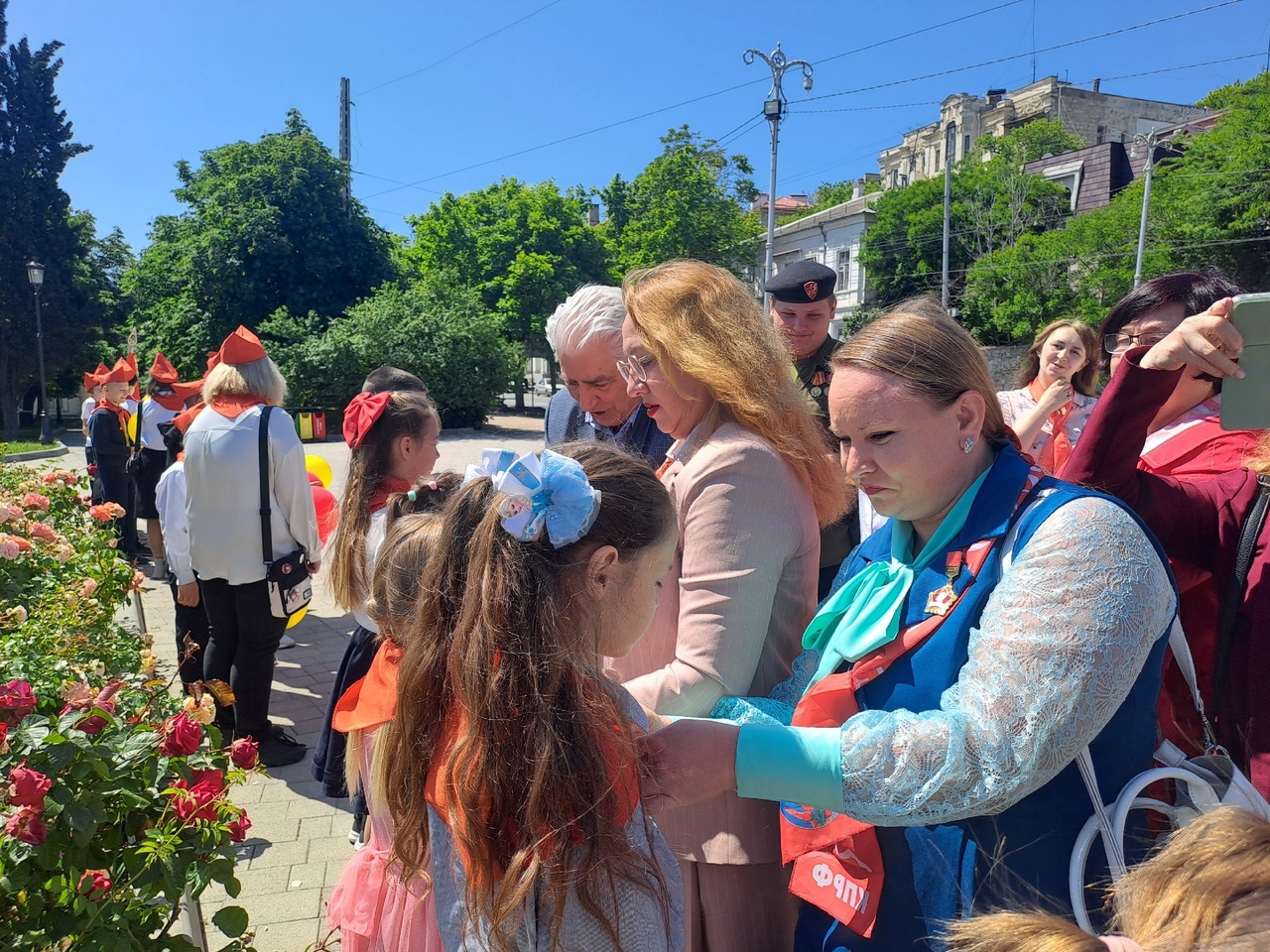Утром 19 мая севастопольские пионеры собрались у памятника Мужеству, стойкости, верности комсомольской на торжественную линейку. Мероприятие началось с приёма новых членов в организацию. Пять мальчишек и девчонок впервые надели красные галстуки, которые повязали первый секретарь СГК КПРФ Василий Михайлович Пархоменко, участник СВО «Булат», Председатель Севастопольского отделения ВЖС «Надежда России» Алёна Васильевна Пастухова, старшая пионервожатая СПО им. В.И. Ленина Наталья Николаевна Чернова.