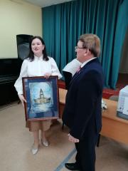 В свою очередь в школе Иванову вручили картину художницы – учащейся школа №27 с изображением видов Курска.
