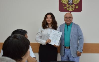 Награду из рук секретаря рескома партии Мигмир Бембеевой получил студент группы ОИ-2Б Санджи Лиджиев.