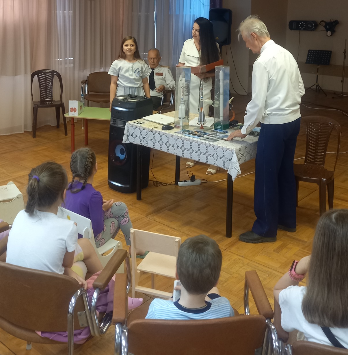 Покорение космоса – одна из тех страниц истории нашей страны, которыми мы безоговорочно можем гордиться. Ветераны Вооружённых Сил подполковник ракетных войск стратегического назначения Гришин Сергей Сергеевич и подполковник ракетно-космических войск, ветеран космодрома «Байконур», Заслуженный испытатель космической техники Гущин Александр Александрович рассказали детям о ракетах и космических кораблях, о Гагарине и Королеве, о мужественных людях – космонавтах, они много тренируются, должны много знать и уметь, чтобы управлять космическим кораблем.