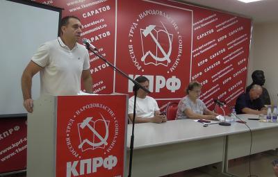 Далее секретарь Саратовского обкома КПРФ, руководитель фракции КПРФ в Саратовской облдуме А.Ю. Анидалов выступил с докладом «О задачах Саратовского областного отделения КПРФ в свете Постановления IX (майского) совместного Пленума ЦК и ЦКРК КПРФ «О задачах КПРФ по сплочению антифашистских сил в борьбе с империализмом, реакцией и военной угрозой».